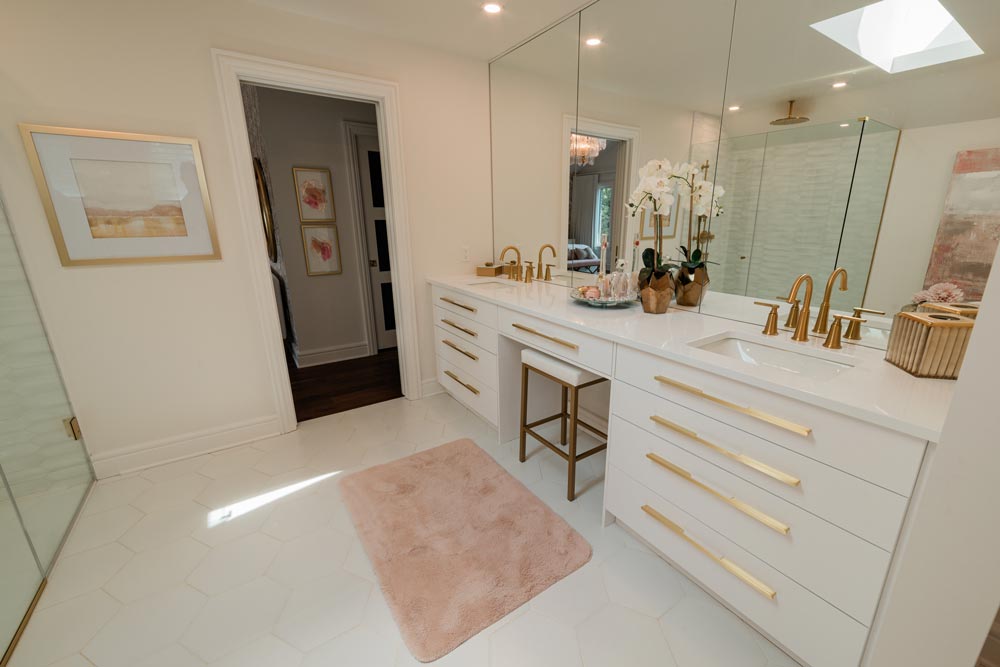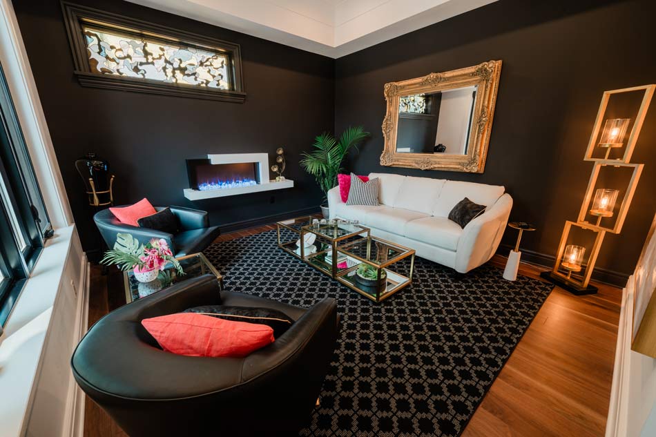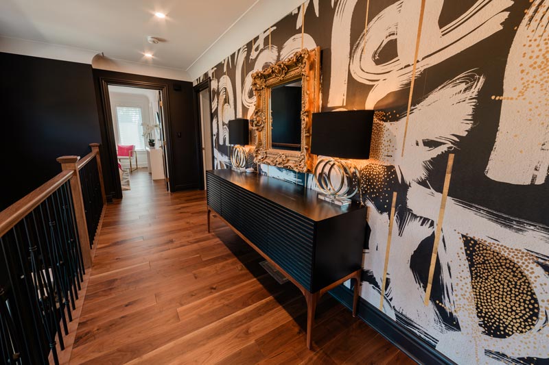 Project Overview: After tearing down an existing wartime home, Concord Homes created this modern, contemporary home. Collaborating with the homeowner, we created anything BUT a builder’s basic home! An expansive and airy main living space with so much light throughout lends itself to the black aesthetics of this home. Our client was fearless in her design choices showing how a dark and moody design can create a sophisticated and functional style. Black will always stand the test of time and our homeowner displayed this with her bold, sleek, and eye-catching décor, featuring accent colors of white, gold, orange, and pink. Custom wallpaper choices in the dining room, primary bedroom, and the sitting area at the top of the stairs, set the tone for excellent contrast.