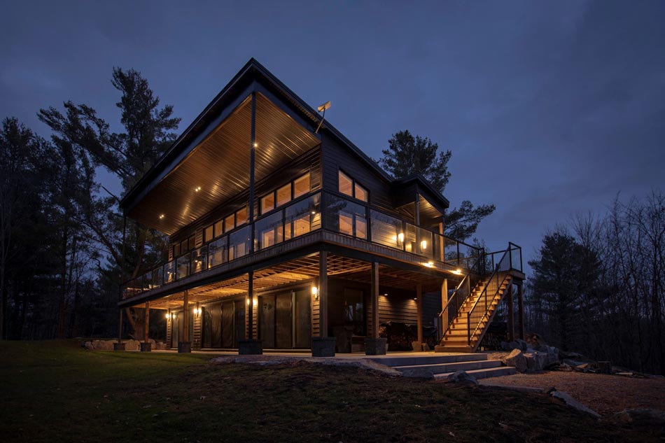 Project Overview: Our clients had a vision right from the beginning of what their cottage should look like. The outcome was an off-the-grid masterpiece that was dark, moody, and stunning. It features an expansive main living area with high-end finishes, stacked windows, and patio doors that lead to a large, wrap-around covered deck to enjoy their scenic waterfront views.
